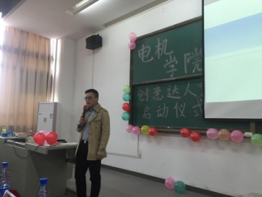 电机学院副主席黄付主持了本次活动,并介绍了“创意达人秀”活动所包含的内容,它除了包含“互联网+”“挑战杯”“LED创意设计大赛”“生活小创意”等几项比赛,还将在电机学院2017届毕业生晚会上举行“创意达人秀”闭幕仪式,获奖学生对作品进行演讲展示。