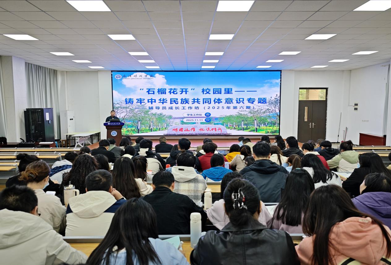 为将铸牢中华民族共同体意识深度融入学生工作全过程,11月11日下午,我校在综二105求索报告厅开展2025年第六期辅导员成长工作坊,本次工作坊以“石榴花开”校园里为主题,聚焦中华民族共同体意识教育开展专题学习和深入研讨。副校长张克华,学生工作处处长孙建伟,各二级学院党总支(副)书记、团总支书记、全体辅导员、学工处全体人员参加会议,活动由学生工作处副处长张静主持。