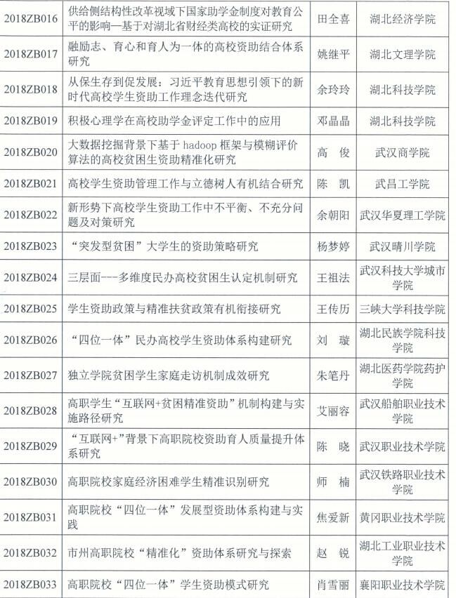 近日,湖北省教育科学规划领导小组公示了专项资助课题2018年立项的通知,其中由我校学生工作处资助管理中心负责人杨梦婷老师协同我校学工处处长刘泽政老师共同申报的”突发型贫困大学生的资助策略研究”被列为湖北省教育科学规划2018年度专项资助一般课题,课题于2018年11月开题,预计在2019年9月结项。