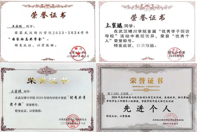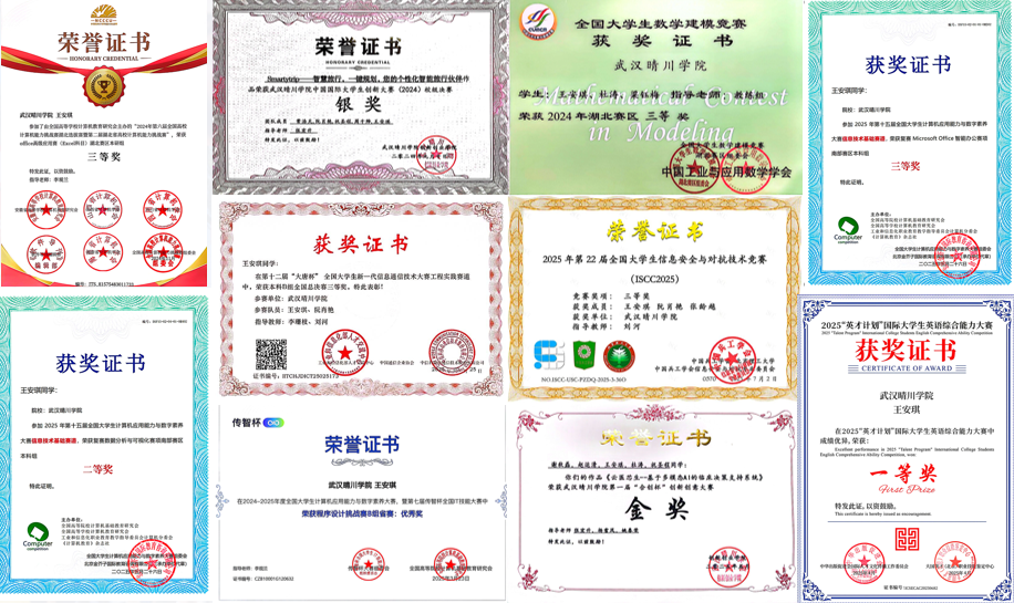 入学以来,王安琪同学积极投身学科竞赛与科技创新实践,在2024至2025年间累计荣获各级奖项18项,其中包括国家级2项、省级11项、校级5项。在综合能力竞赛中,她注重外语与办公应用技能的双重提升,先后获得“英才计划”国际大学生英语综合能力大赛一等奖,以及第六届全国高校计算机能力挑战赛Word、Excel科目湖北赛区三等奖。此外,她在体育领域也展现出积极风貌,曾参与并助力团队夺得武汉晴川学院“樱花杯”第一届乒乓球混合团体赛冠军,展现了“文武双全”的青春风采。