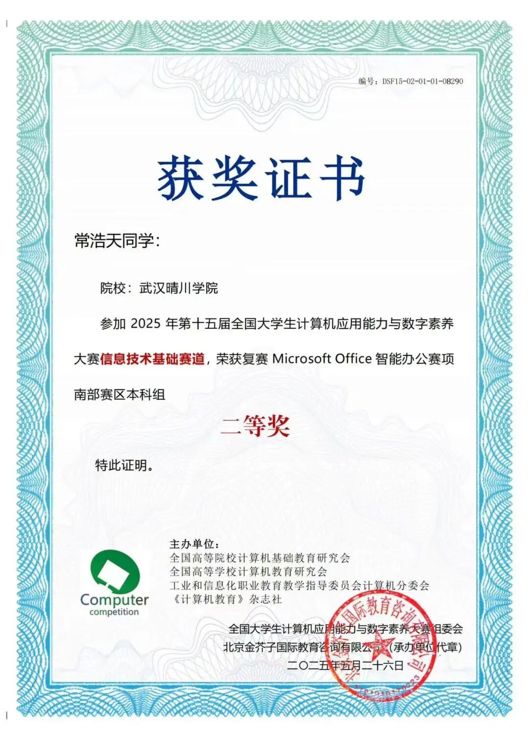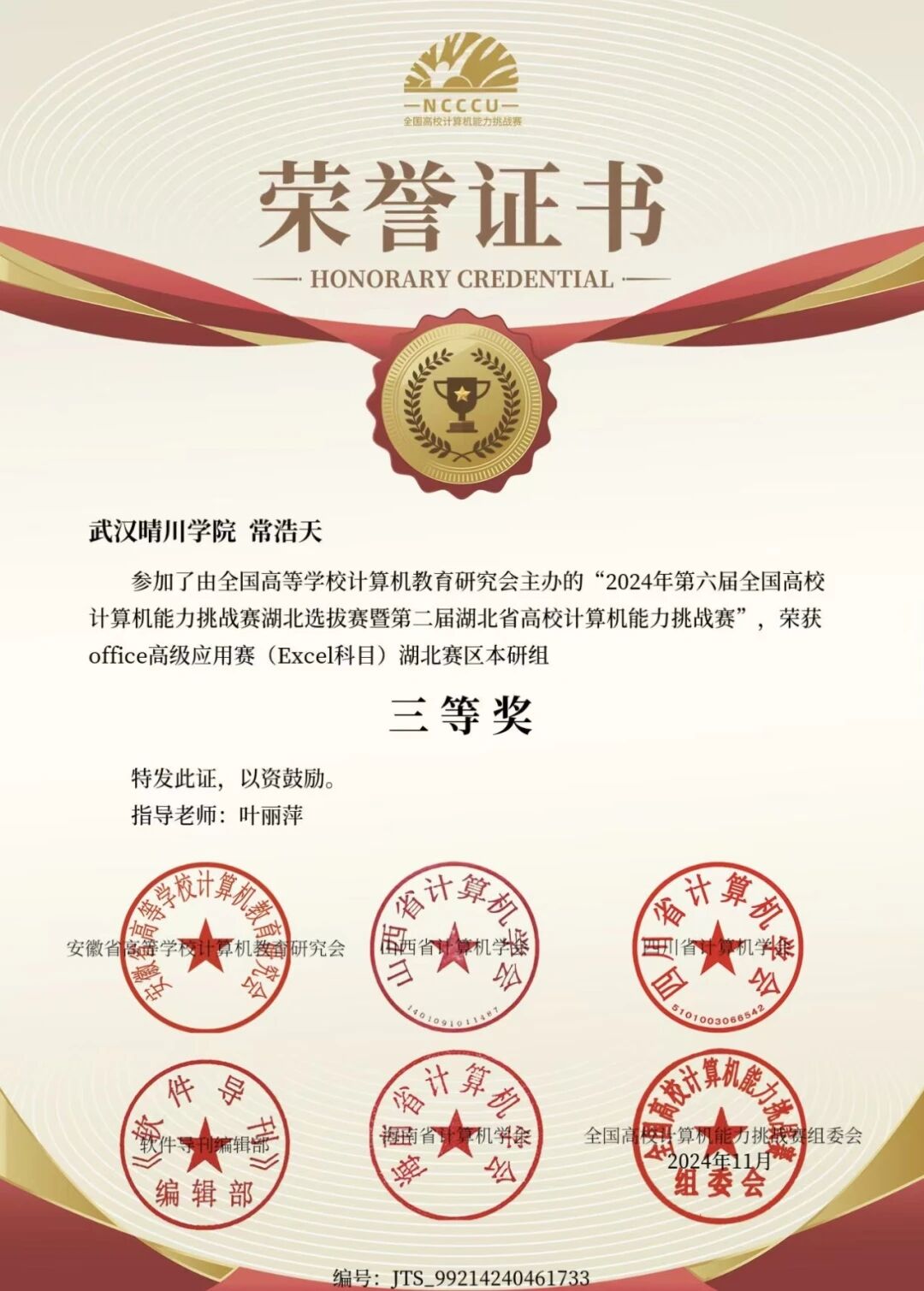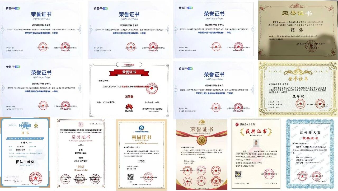 同时,他坚持以赛促学,在多项高水平学科竞赛中屡获佳绩,曾获程序设计挑战赛Java科目湖北赛区一等奖、华为ICT大赛实践赛湖北省赛网络赛道高教组三等奖、团体程序设计天梯赛湖北省“华山论剑”三等奖,以及2023年大学生数字技能应用大赛C语言科目全国初赛本研组三等奖等4项国家级、10多项省级奖项。在一次次代码调试与难题攻克中,他不断锤炼专业技能,展现出扎实的工程实践能力与创新思维。