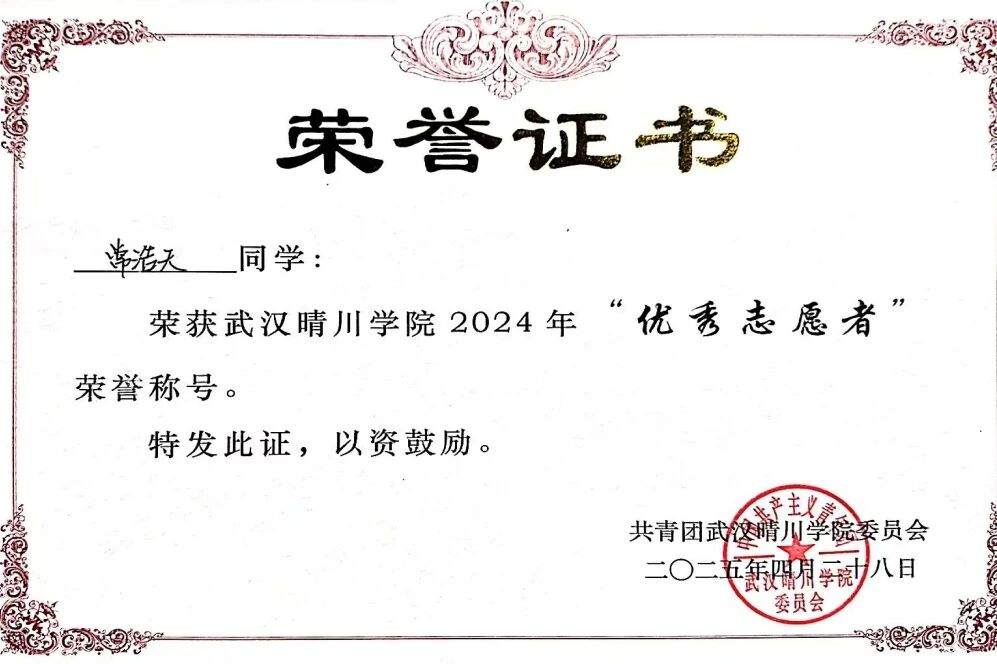在夯实理论基础的同时,他注重以赛促学、以践促能,通过学科竞赛深化专业理解、锤炼实践能力。累计获得国家级奖项1项、省级11项、校级8项,在挑战中不断超越自我。凭借全面发展的突出表现,他还获评“优秀学生干部”“优秀志愿者”等多项荣誉,展现出扎实的综合素养与持续成长的潜力。