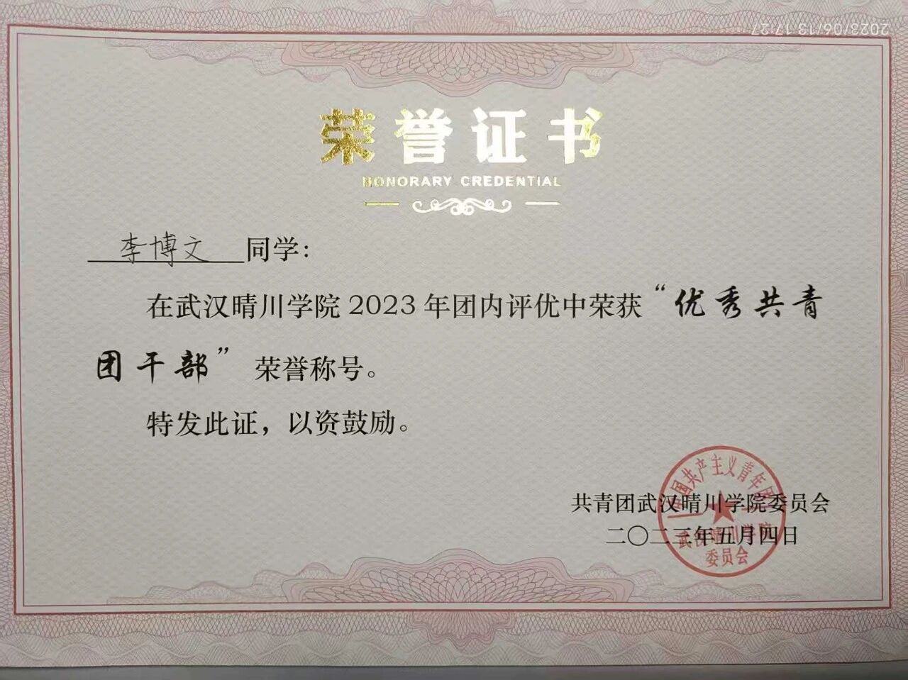 “担当者,事竟成。”在担任计算机学院团总支副书记、学生第一党支部秘书组成员期间,李博文以“服务同学、助力学院”为己任,秉持务实奉献的精神,在服务师生中锻炼成长。他设计特色工牌,参与指导制作爱国主题团校视频,相关工作获得师生广泛认可;组织策划“植此春光”植树节、中国航天日主题活动、“百生讲坛”等多项学院品牌活动,助力多个团支部获评“活力团支部”;积极推动基层党支部建设,协助党支部开展主题党日活动,并统筹“将星启航”实践团赴红安开展红色学习实践。在从任务执行到活动统筹的角色转变中,他不断锤炼自身的组织协调与沟通能力,以实际行动诠释了新时代学生骨干的责任与担当。