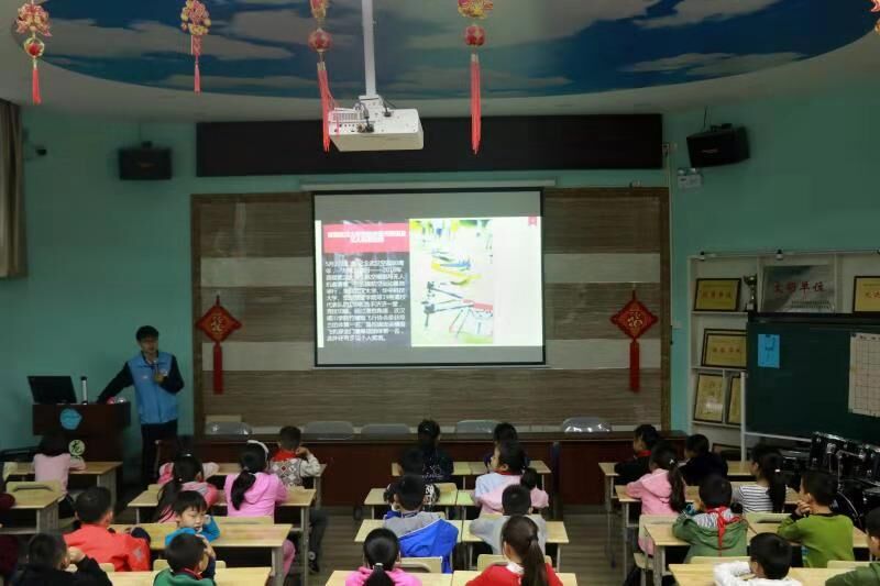 竹蜻蜓飞行协会肖俊樊会长在多媒体教室向龙泉小学的孩子们介绍了飞协的发展史以及航空模型与无人机的飞行原理,倡导孩子们刻苦奋进。大屏幕上展示了由飞协航拍剪辑的2018年武汉晴川学校军训视频,展现了晴川学院当代大学生的风貌,小学生们赞叹不已,表示对大学生活充满向往。