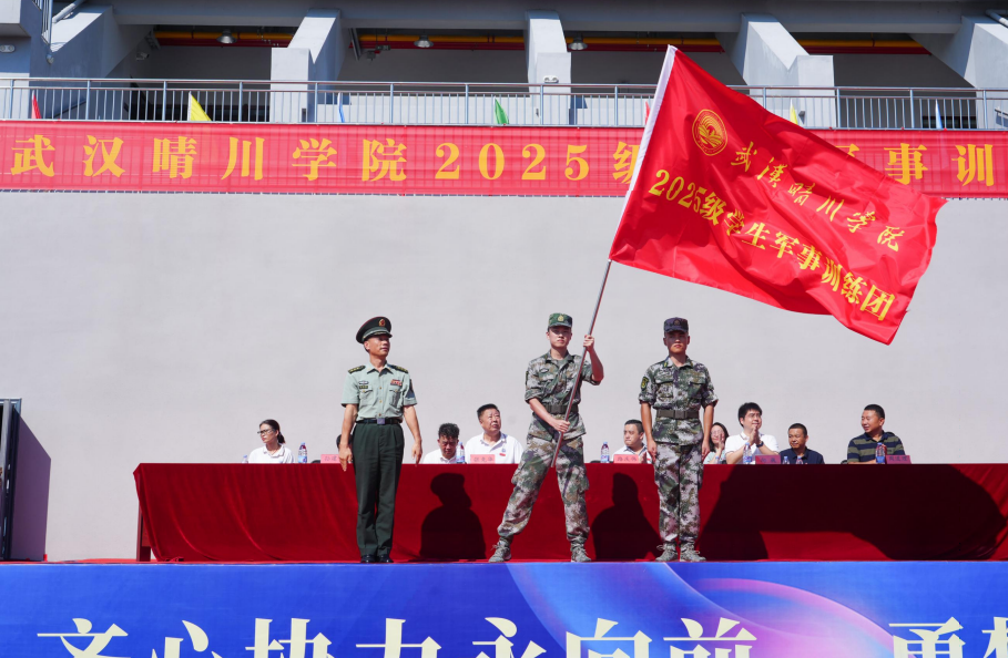 9 月 16 日上午,武汉晴川学院2025 级新生军训开训仪式在腾龙田径运动场隆重举行。汉阳区委常委、区人武部政治委员路庆伟上校,党委副书记、副校长向巍,副校长张克华,后勤保卫处处长周道理,各二级学院党总支书记,承训教官及辅导员代表,与 2025 级全体新生共同出席开训仪式。此次活动由党委学生工作部部长孙建伟主持。开训仪式在庄严的国歌声中拉开帷幕,全体师生肃立行礼,伴随着《义勇军进行曲》,五星红旗冉冉升起。