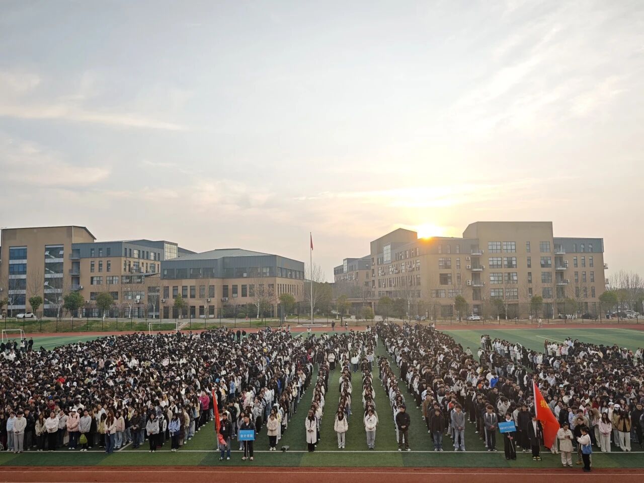 晨光熹微,红旗猎猎。2026年3月13日清晨,武汉晴川学院学生工作处在学校腾龙田径运动场组织开展新学期首次爱国主义教育暨升国旗主题思想教育活动。学生工作处负责人、各学院团总支书记、全体辅导员以及大一、大二全体学生和大三全体班委参加此次活动。