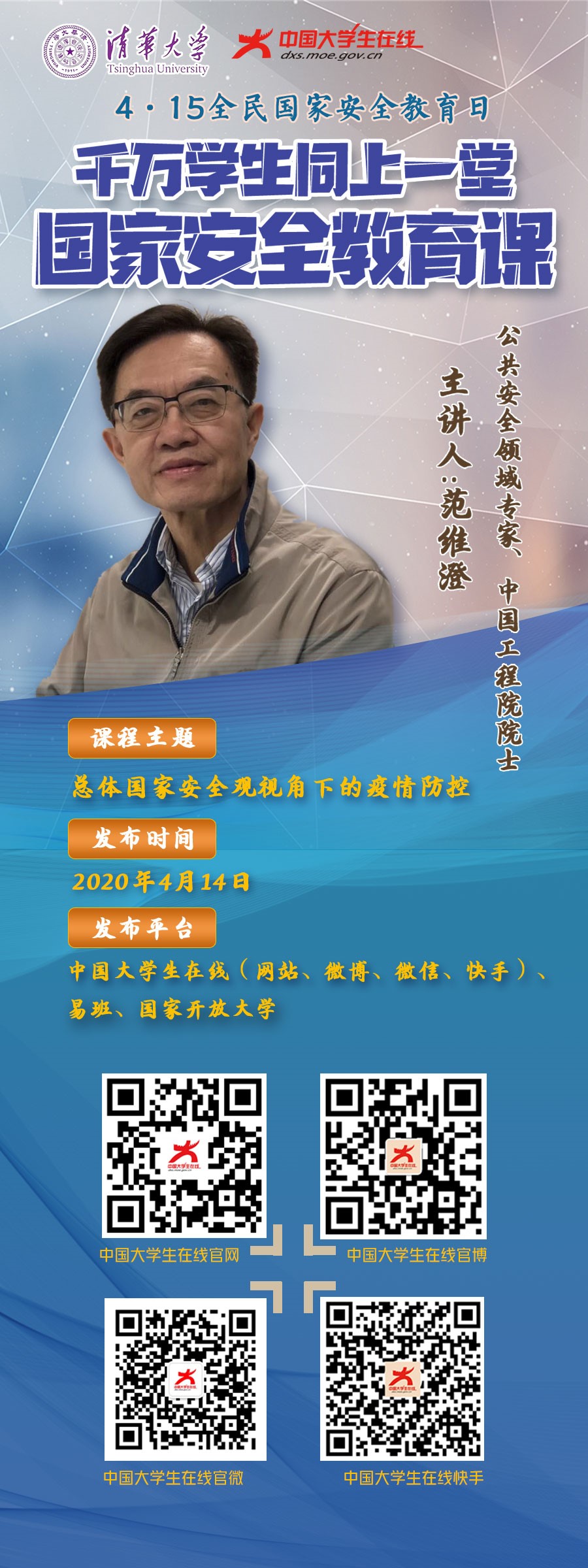 (一) 观看专题公开课。由教育部组织录制,公共安全领域专家、中国工程院院士范维澄为全国大学生讲授《总体国家安全观视角下的疫情防控》千万学生同上一堂国家安全教育课,于4月14日上线,观看方式如下图,各学院可结合网络授课计划,有序安排学生错峰错时观看学习。