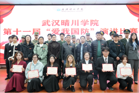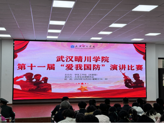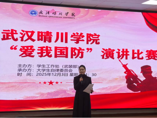 国无防不立,民无兵不安。为深入学习贯彻党的二十大精神,深化全民国防教育,激发青年学子的爱国热情与报国之志,2025年12月初,武汉晴川学院第十一届“爱我国防”主题演讲比赛决赛在学术报告厅隆重举行。作为学校2026年春季征兵宣传月的重磅开场活动,本次比赛不仅是一场语言的竞技,更是一堂生动的国防教育大课。来自各二级学院的11名参赛选手同台竞技,用青春之声讲述国防故事,以赤子之心抒发强军壮志。